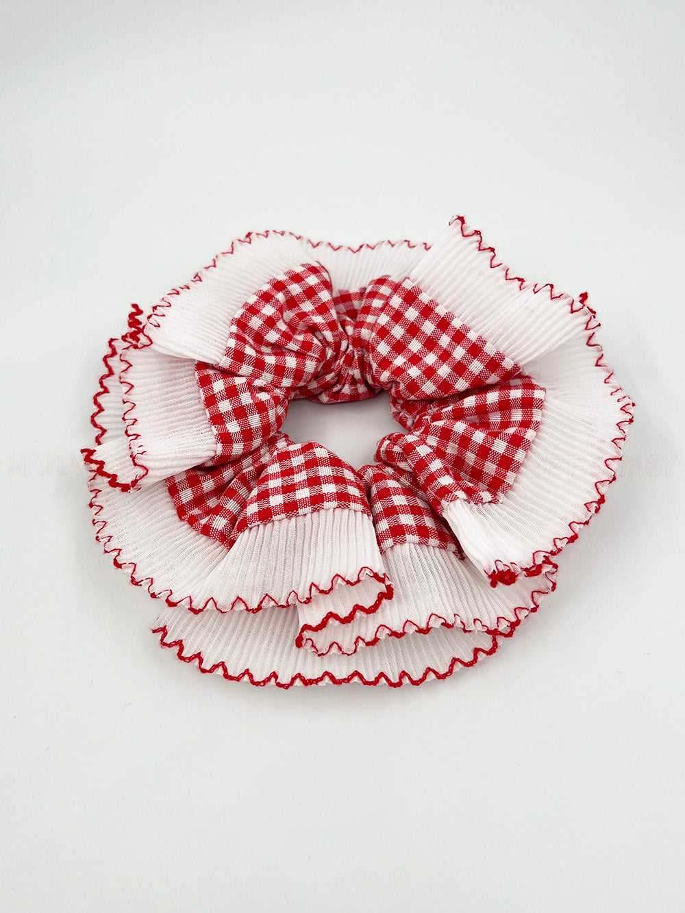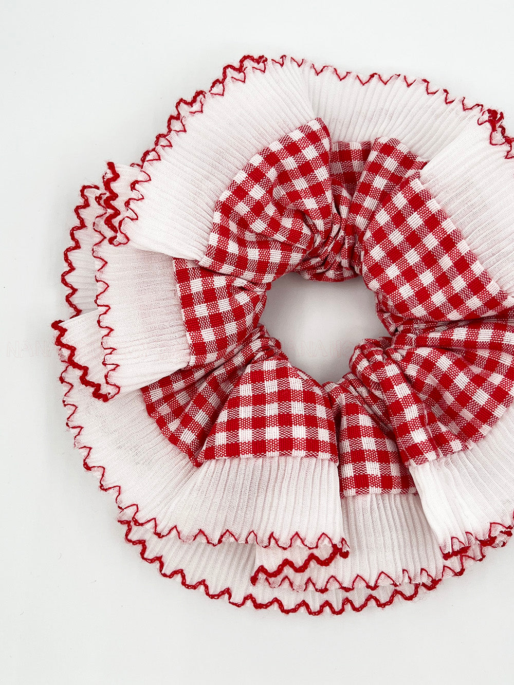 Capture classic countryside charm with our Oversized Red Gingham Scrunchie with White Lace Trim. Featuring a vibrant red gingham pattern and finished with delicate white lace, this scrunchie brings a sweet, vintage-inspired touch to any hairstyle. The oversized design offers a soft, voluminous hold that’s gentle on your hair, reducing breakage and creases. Perfect for picnics, casual days, or adding a playful retro accent to your look, this scrunchie is pure nostalgic beauty with a modern twist.