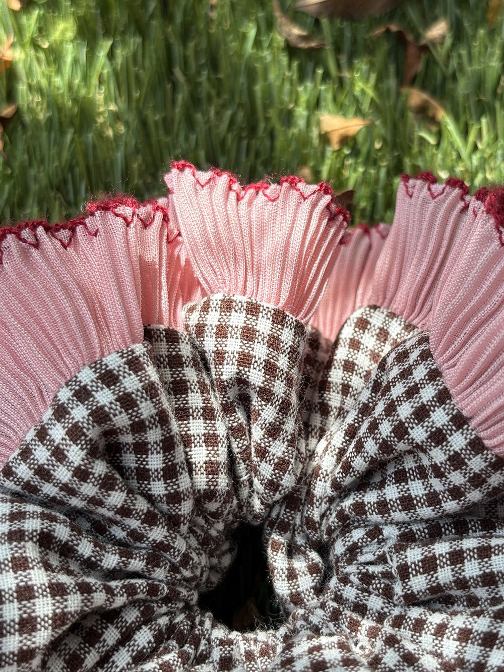 Step into cozy charm with our new design oversized scrunchie, featuring a brown checked pattern trimmed with delicate lace. Inspired by the warmth of a bakery girl aesthetic, this scrunchie blends vintage sweetness with everyday comfort. Its oversized, fluffy silhouette adds volume and style while staying gentle on your hair. Perfect for cottagecore lovers, cozy cafés, or soft fairycore outfits — it’s a fresh new addition to our beloved Fairy Series. ☕🤎✨