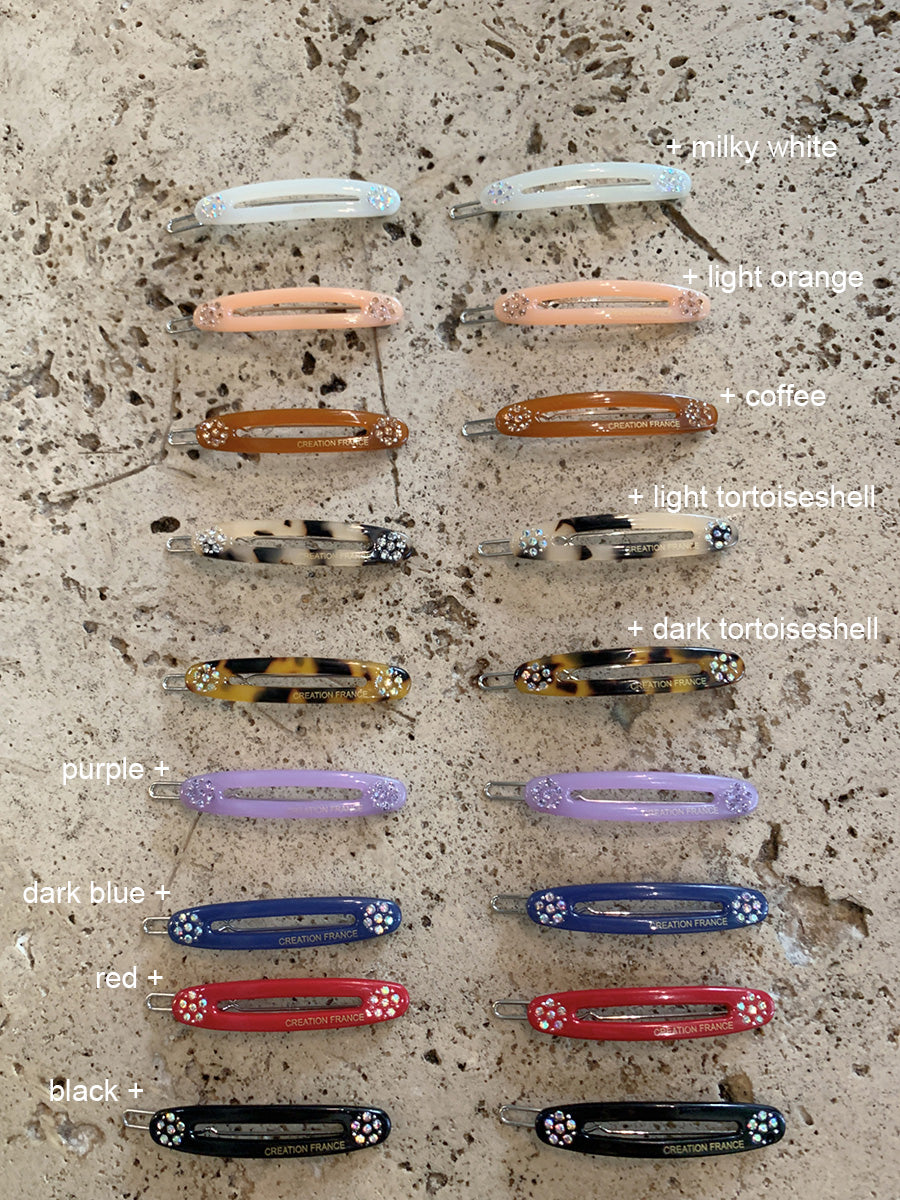 Brighten up your hairstyle with our Oval Jelly Hair Side Clips, crafted from high-quality acetate for a smooth, glossy finish. Featuring a jelly-like translucent color and adorned with a sparkling diamante little flower, these clips add a touch of playful elegance to any look. The oval shape ensures a chic, modern vibe while keeping your hair neatly in place. Perfect for daily wear or special occasions, they’re the ideal blend of cute, stylish, and functional.