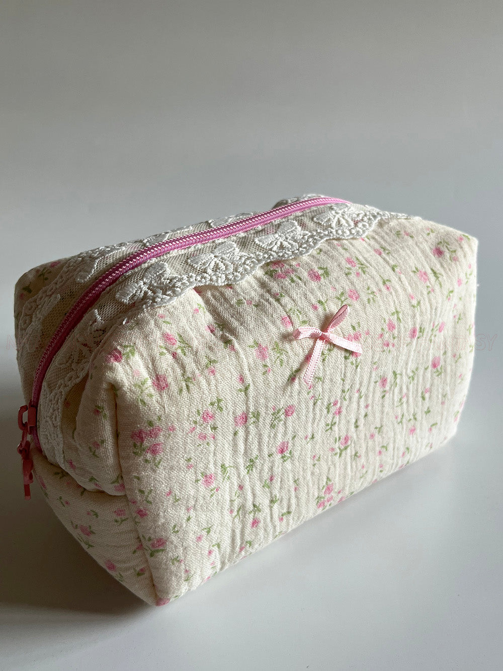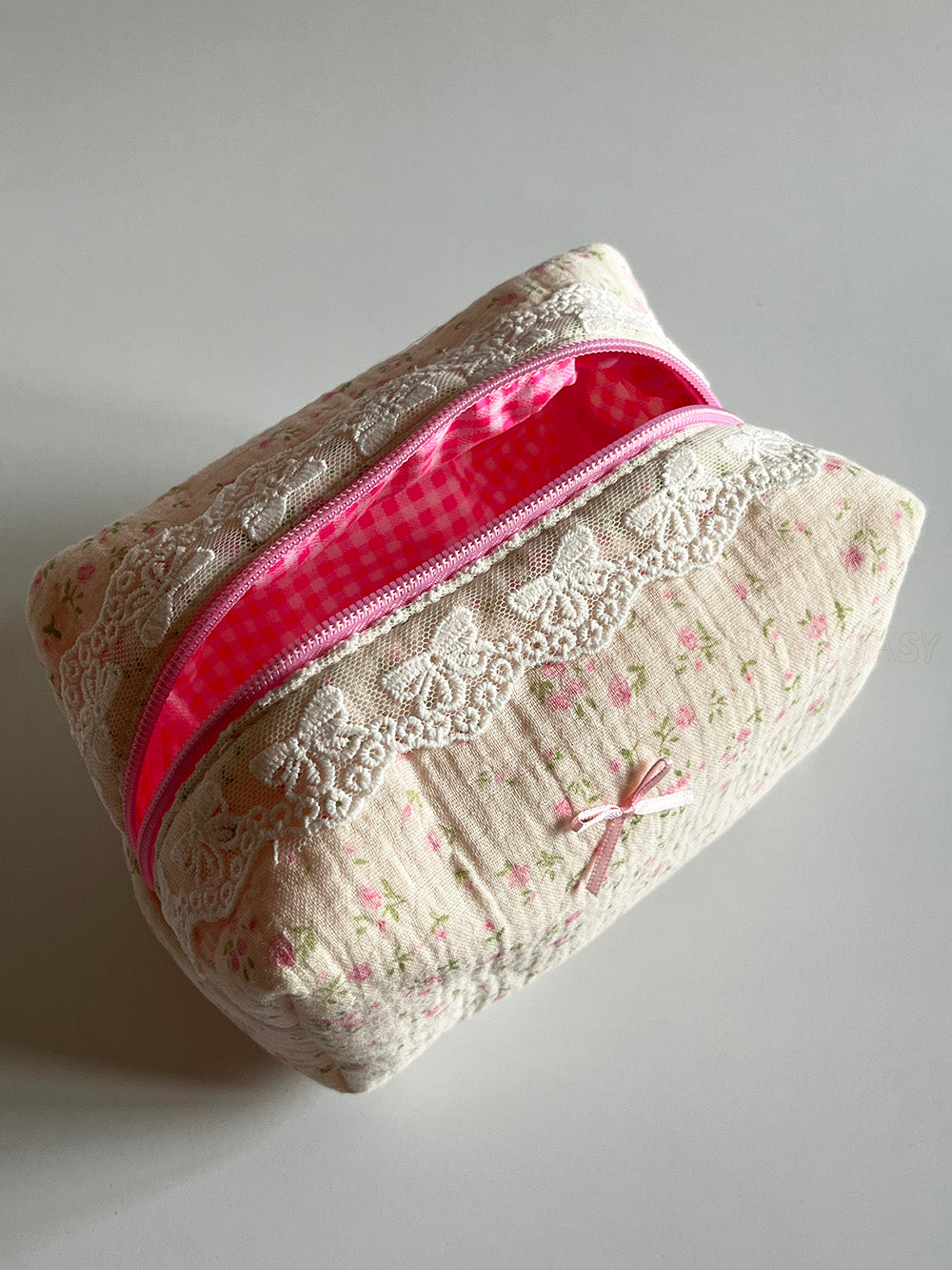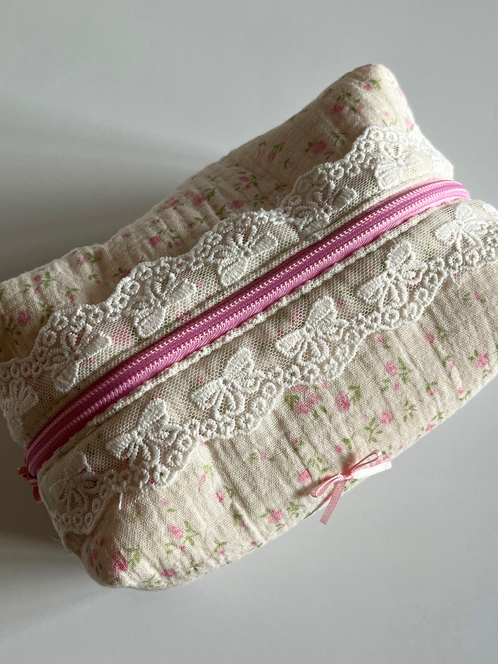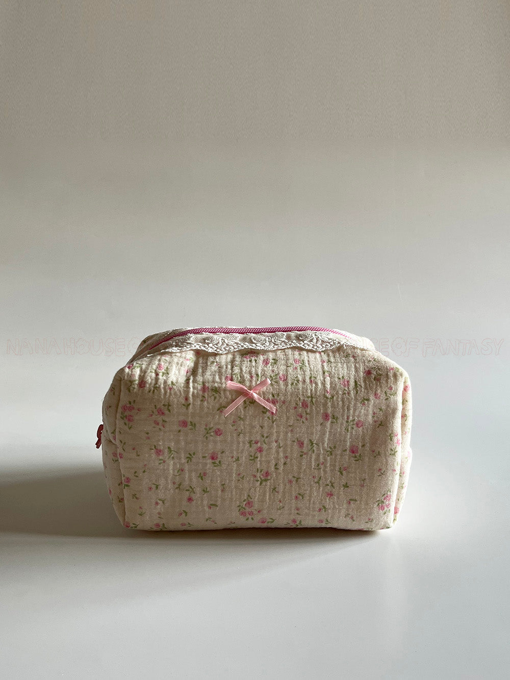 Lace-Trimmed Bowknot Little Rose Makeup Pouch