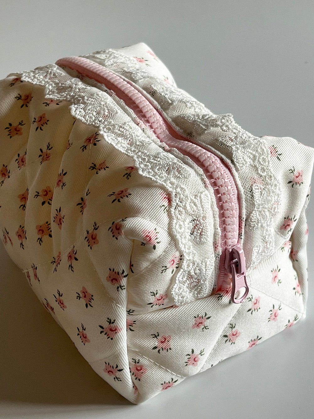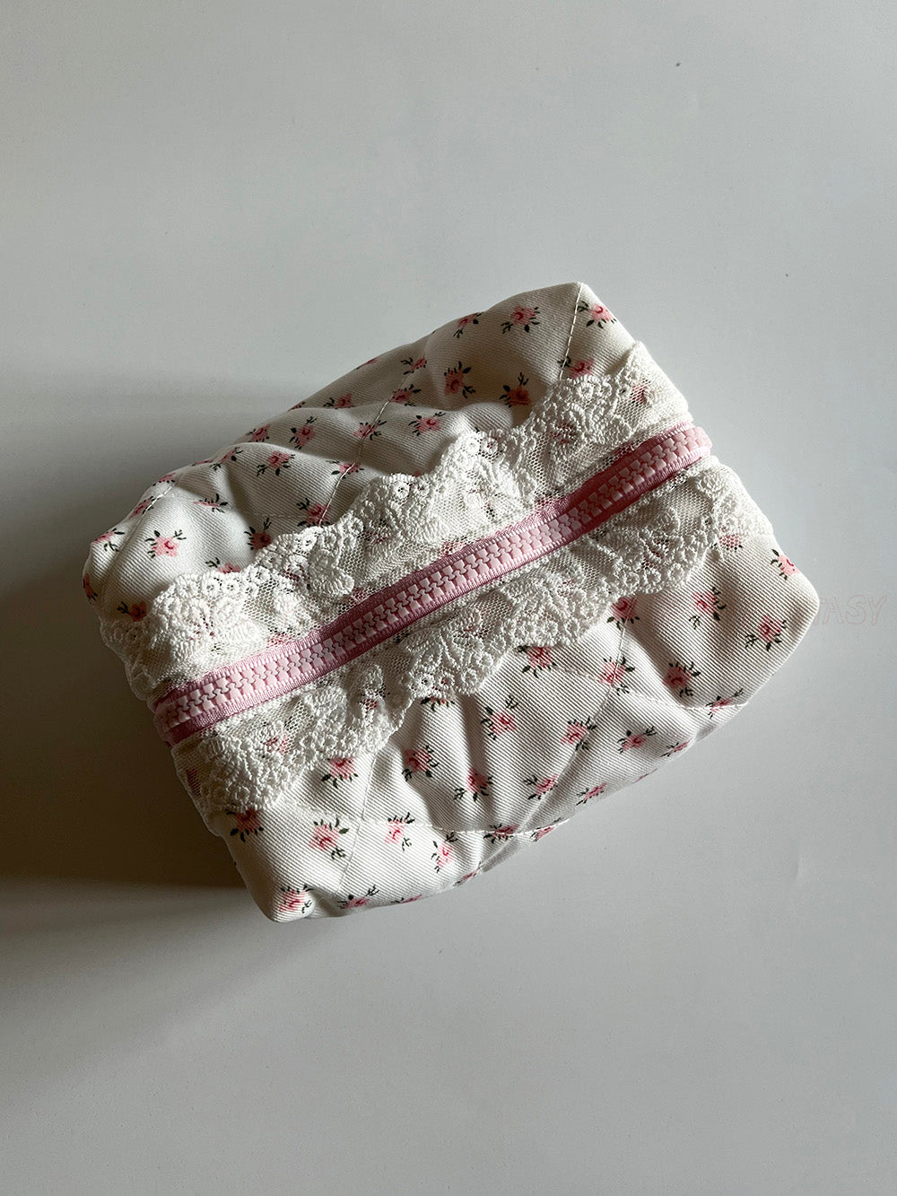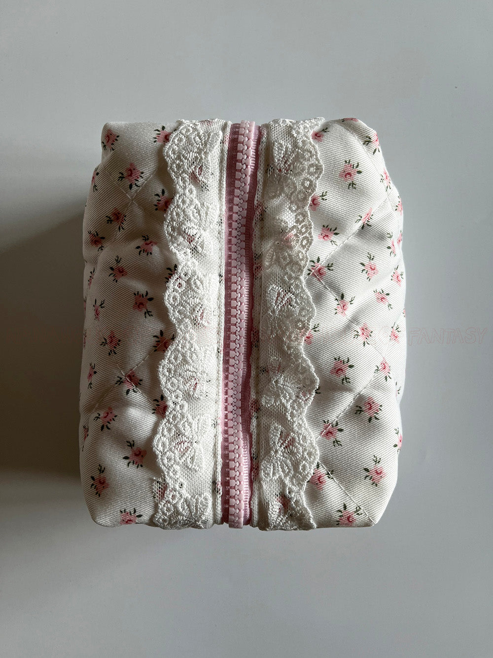 Lace-Trimmed Dreamy Garden Pink Floral Makeup Pouch